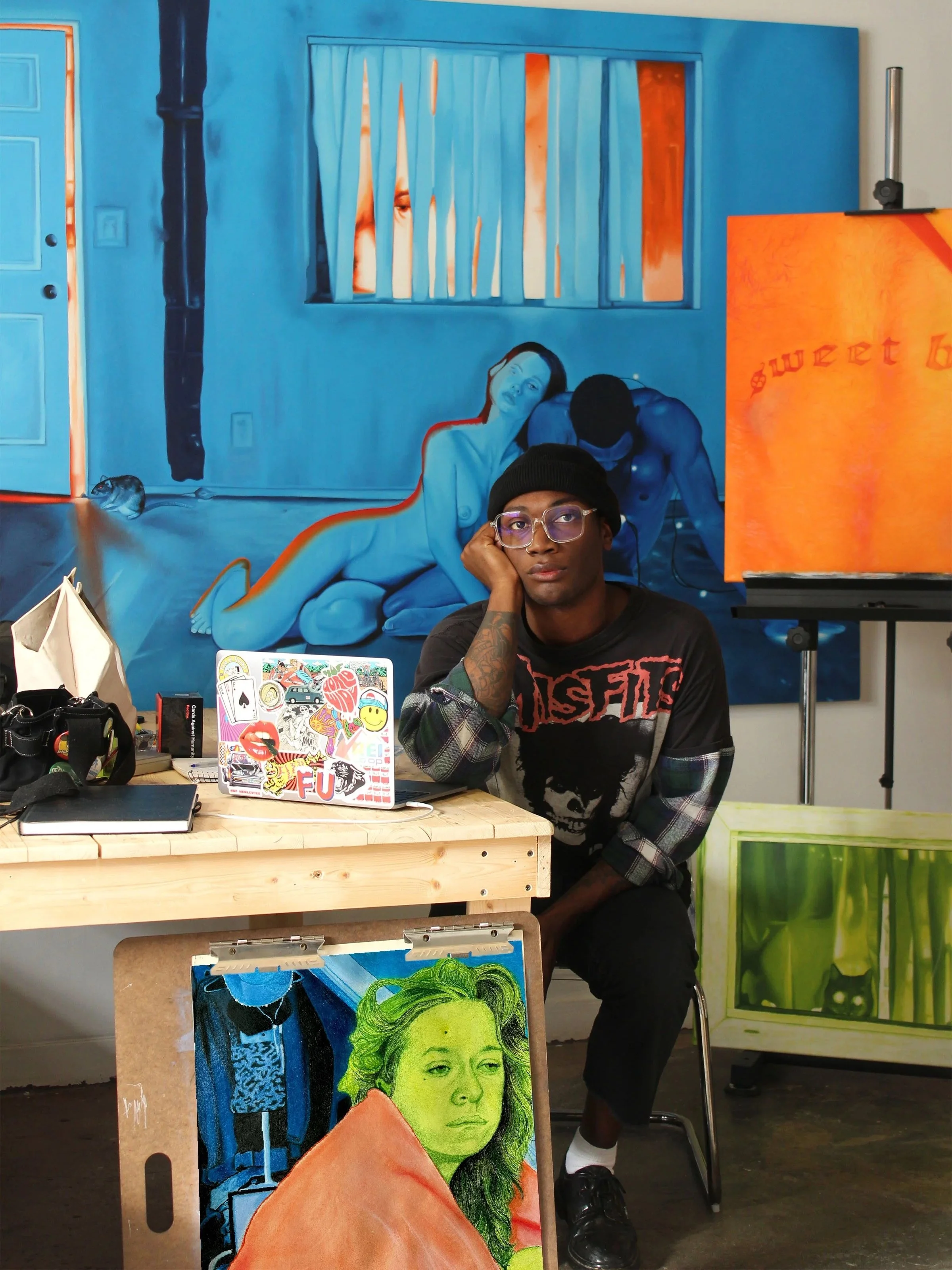 Working in oil, acrylic, and pencil, Winn experiments with light, space, and metaphorical objects to evoke both the iconic and the eerie within his portraiture. His compositions often feel suspended; figures caught in moments of introspection, overstimulation, or quiet collapses mirroring the psychological weight of existing in a hyperconnected world.